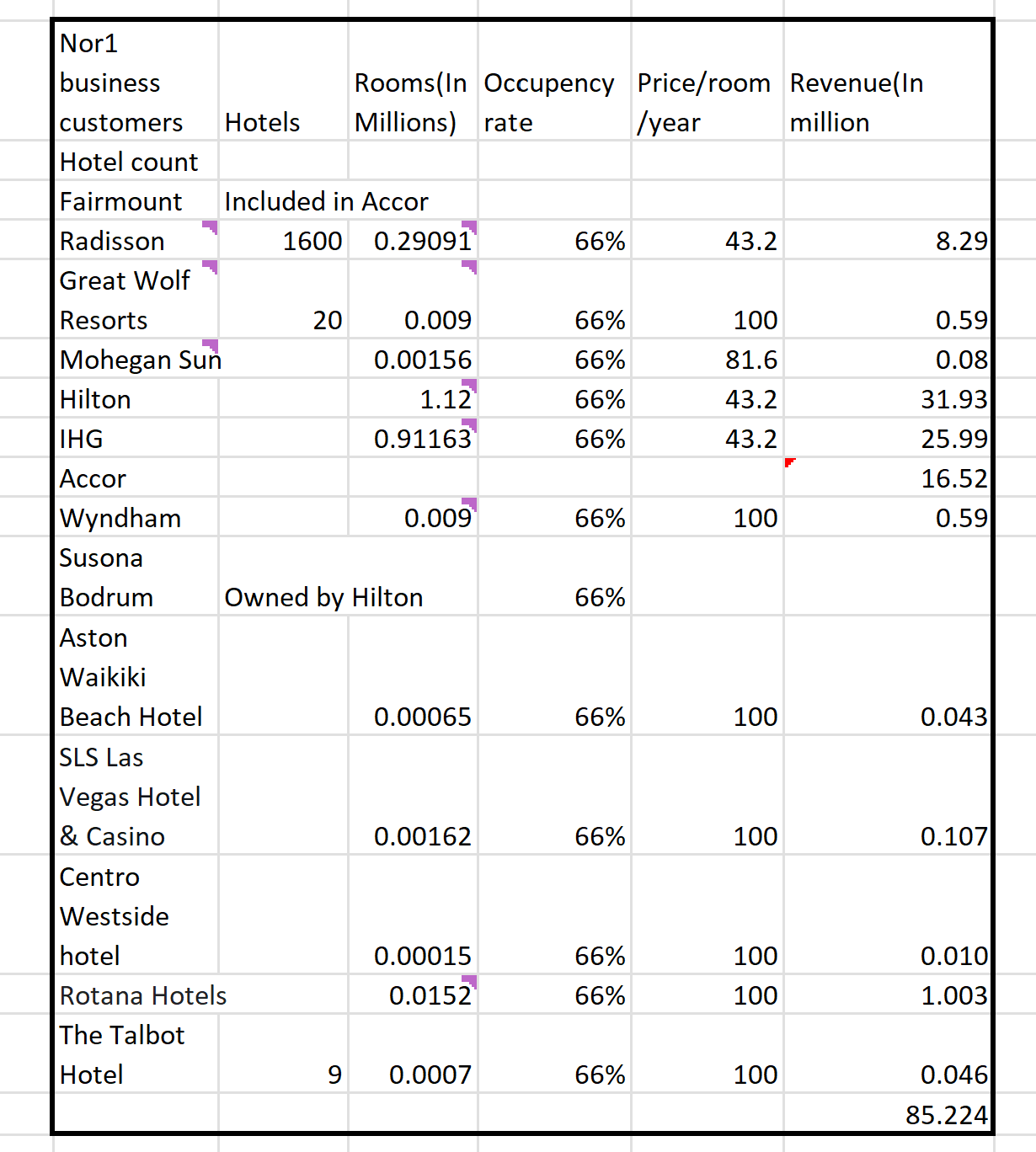 how many hotels are Nor1 clients and how many rooms each hotel has, I can estimate